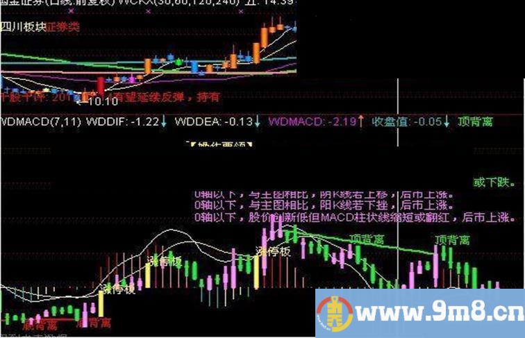 DRAWTEXT(CURRBARSCOUNT=40,WZ*0.90,'0轴以上,股价创新高但MACD柱状线缩短,后市下调或下跌。')COLOR44FF00;