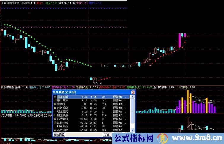 说明在主图中加入了系统自带的SAR附图指标提示,加了压力支撑线提示,另外,涨跌停用粉色和蓝色进行标注,一目了然。