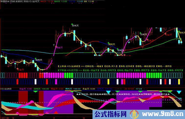 2在底部用另一条彩条的不同色块分别表示KDJ的日周月金叉或死叉讯号。