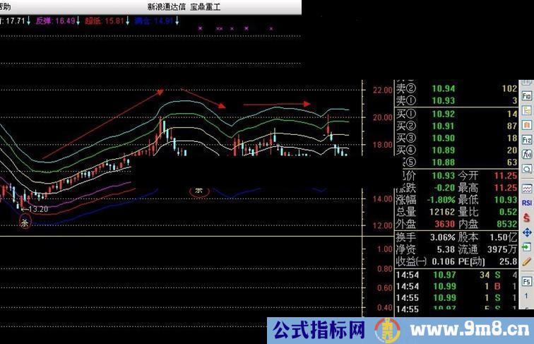 蓝色是满仓线 红色是超低线 紫色是反弹线 白色是平衡线 黄色是回档线 绿色是风险线 青色是平仓线