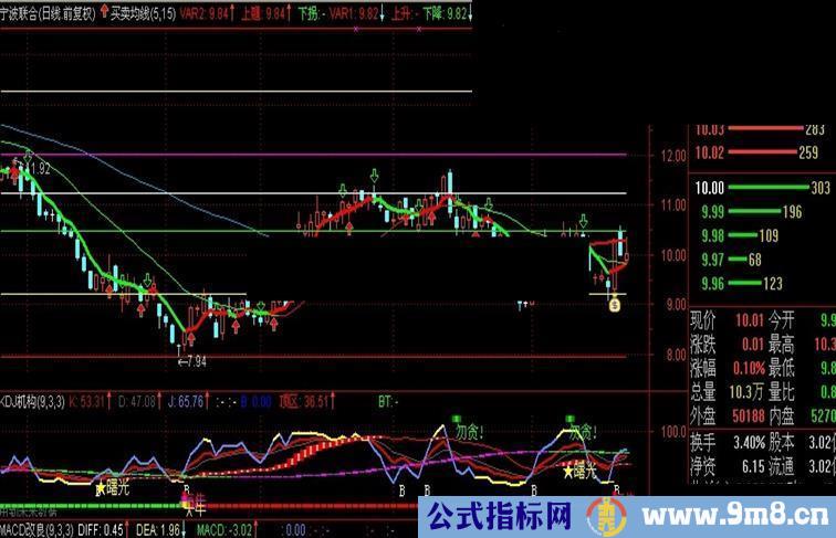 本主图指标为三条变色均线与多条黄金分割线组成,上涨下跌、压力支撑一目了然,买卖决策,简洁明了,便于指导操作。