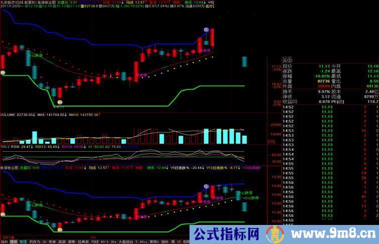 涨停板人人渴求,可是现实中有多少涨停板与你我失之交臂,跌停板人人恐惧,可是挨过跌停的滋味经常尝到。本指标没有噱头,只是用简洁的线条和文字,在主题中提示你可能涨停或者跌停的位置。如果你以为有了这个指标就能无往不胜,那恐怕是笑话,但是如果你有比楼主推荐的这个指标更准确的指标,那么期望在本帖打个擂台!