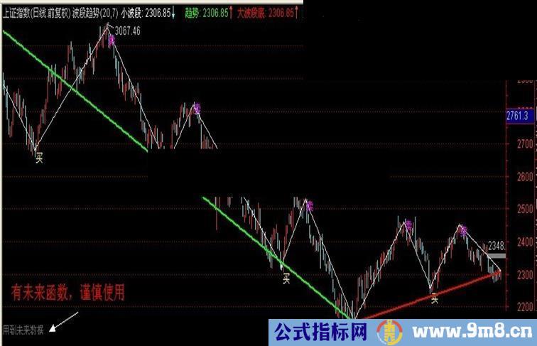 由于本指标含未来函数,使用者一定要谨慎使用,尤其是参数P较小的时候。虽有未来函数,但当我们不能通过其他指标图形看清趋势的时候,有胜于无。