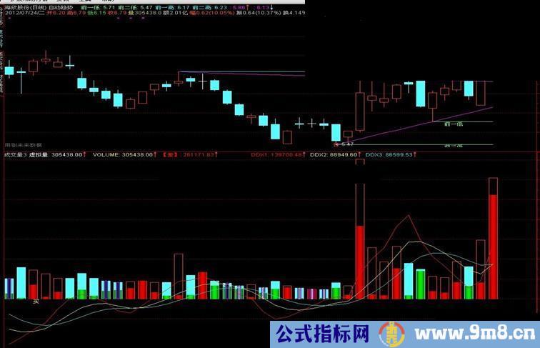 前一低:REF(L,BARSLAST(VV)),COLOR99FF66,LINETHICK1;