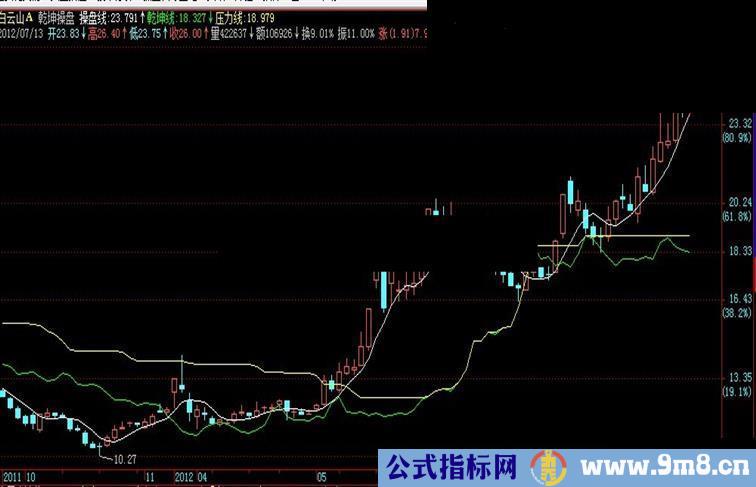 均价:=(2*C+(C+H+L+O)/4+O)/4; R:=(L+2*均价)/3;R1:=(H+2*均价)/3; 操盘线:MA((R+r1)/2,5),COLORWHITE; 乾坤线:EMA((REF((R+r1)/2,13)+REF((R+r1)/2,21))/2,1),COLORGREEN; 压力线:HHV((REF((R+r1)/2,13)+REF((R+r1)/2,21))/2,34),COLORYELLOW;