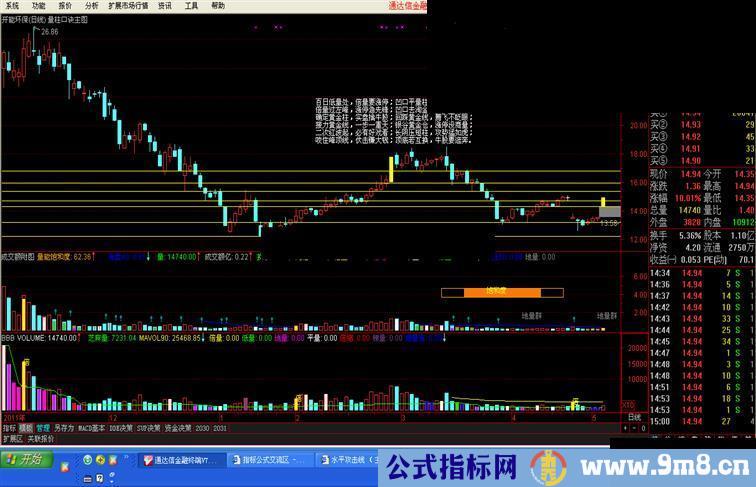 DRAWTEXT(TJ2,LLL+HH*0.85,'倍量过左峰,涨停急先锋;凹口去淘金,报四三涨停;');