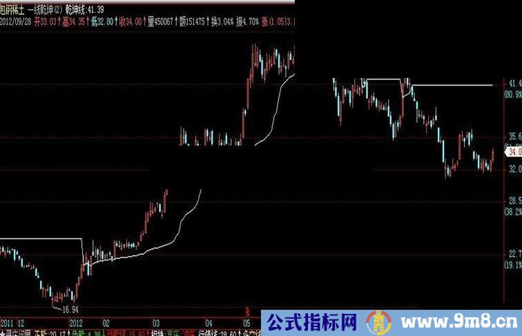N的取值在1,2,3。取值不同确定的获利比例不同,乾坤线则不同。比如N取值为2表示38.2%的获利和成本分布在38.2以上。 P:=IF(N=1,0.191,IF(N=2,0.382,IF(N=3,0.618,0.5))); A:=REF(C,BARSLAST(WINNER(C)>=P)+1); 乾坤线:EMA(IF(WINNER(C)>=P,COST(38.2),A),1);