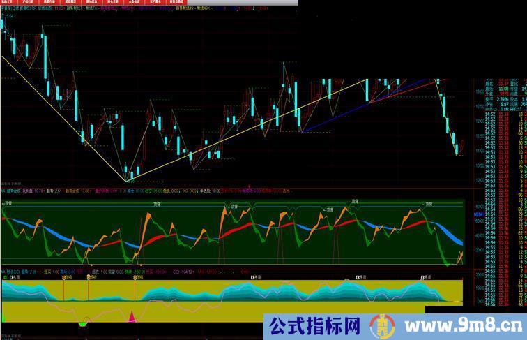 趋势射线49: DRAWLINE(H=HHV(H,49),H,L=LLV(L,49),L,0),COLORYELLOW,LINETHICK2;