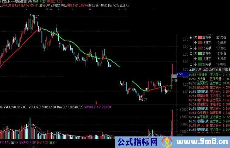 一根筋主图,关键均线加了变色,简单得拿不出手,但重要性大家应该知道的,不多说了! MA1:MA(CLOSE,20) COLORGREEN LINETHICK2; MA1红:IF(MA1>=REF(MA1,1),MA1,DRAWNULL),COLORRED,LINETHICK2;
