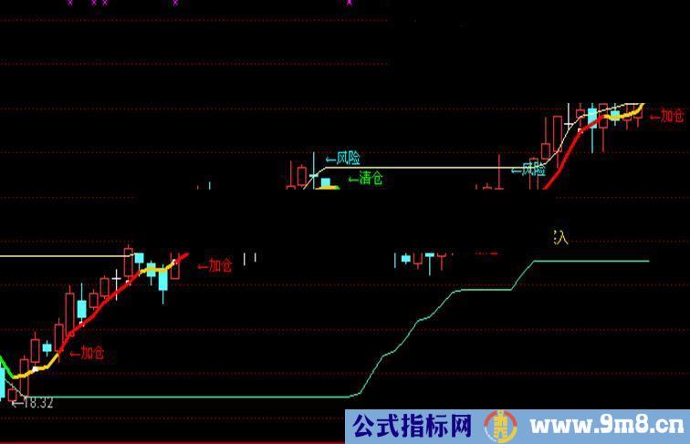 DRAWTEXT(减仓,HIGH*1.02,'←风险'),COLORCYAN;