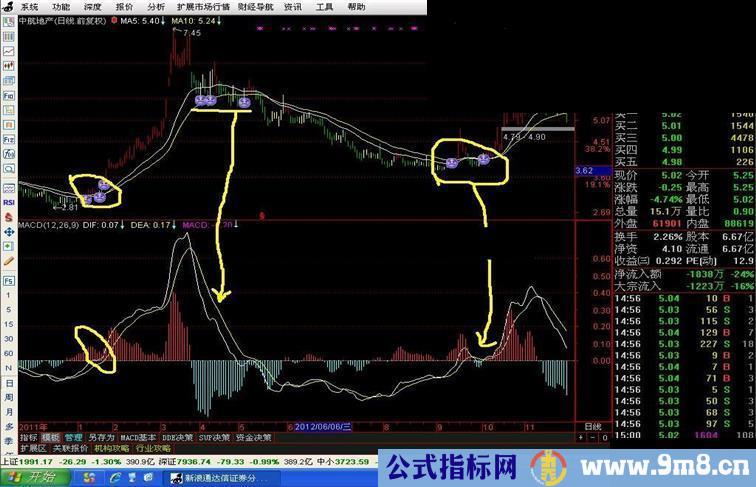 此公式配图为一支地产股,出现信号以MACD翻红,即将浮出水面为好,高位追涨且MACD为死叉状要小心,一般次日获利就要走,拉高出货的股必须这么弄。