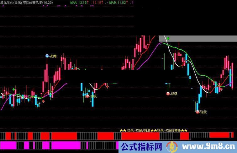 DRAWTEXT_FIX(1,0.5,0.84,0,'★★ 红色--均线A持股★★粉色--均线B持股★★'),COLOR00FFFF;