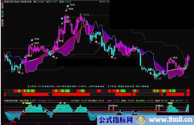 均线箱体差值主图指标试想通过均线、均线角度线、箱体、KDJ指标及差值综合显示买卖信号: