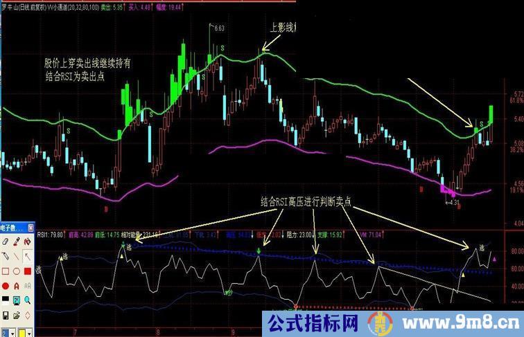 2、股价上穿卖出线继续持有,结合RSI作为判断第一卖出点,当股价回落卖出线时为第二卖出点。