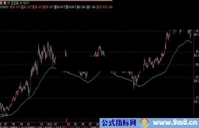 本指标仅仅一线条,所谓五五底,就是55日实体K线下沿而做。先按55日,也可改为34或60等等。除极端情况外,一般跌到这里就会有反弹,如果此线走平抄底可为。