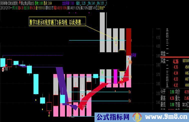 带牡丹红柱体的K线表示K线实体(开盘和收盘)穿越三根或三根以上均线 上方数字表示K线穿越均线根数 数字3表示K线穿越了3条均线 以此类推...