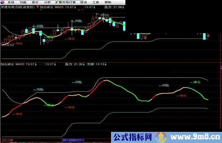 DRAWTEXT(减仓,HIGH*1.02,'←风险'),COLORCYAN;