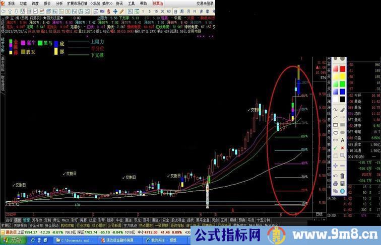 涨40﹪:IF(CURRBARSCOUNT<=10 AND H>REF(C,DAYS)*1.4 ,REF(C,DAYS)*1.4,DRAWNULL),COLORMAGENTA;