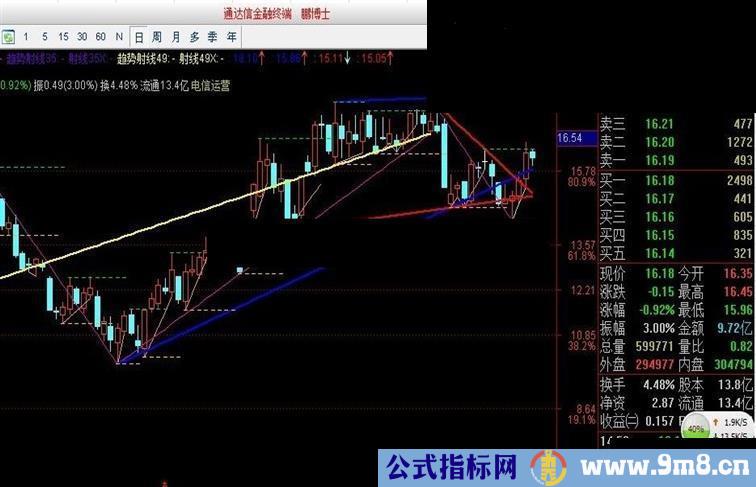 趋势射线49: DRAWLINE(H=HHV(H,49),H,L=LLV(L,49),L,0),COLORYELLOW,LINETHICK2;