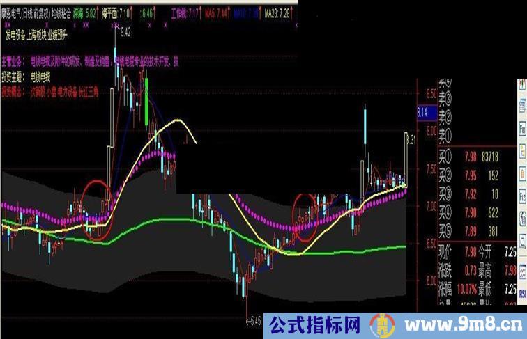 使用方法:股价在工作线(紫色圆点线)之上,海面附近,形成均线多头排列,最好是小阴小阳的爬升,但需要量能的配合,这是大体选股,剩下的操作需要结合另外的指标,进行确认。