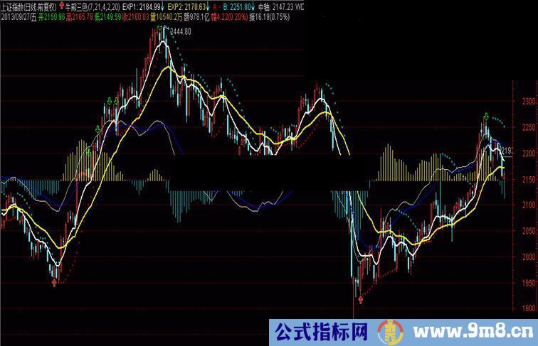 判断股票运行趋势强弱的方法,被称为“牛熊三色”,牛熊三色每翻红一色,就可以增加1/3的仓位,三色全翻红的时候基本可以满仓。这三色分别是:MACD指标,DIFF金叉DEA,即MACD出现红柱的时候即为翻红;SAR指标,股价重新回到SRA指标以上,SAR转向到股价之下运行即为翻红;EXPMA指标,7号操盘线(参数7)金叉2号操盘线(参数21)即为翻红。 类型为主图