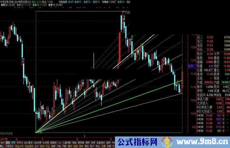 角度30:IF(TS>=0 AND 低点+(差30度/天数横线)*TS<=高点,低点+(差30度/天数横线)*TS,DRAWNULL),COLORWHITE,LINETHICK1;