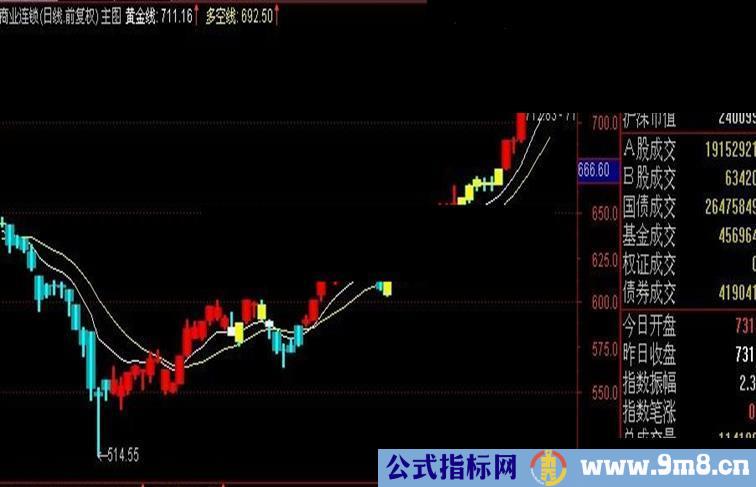 多空线:(20*CJ+19*REF(CJ,1)+18*REF(CJ,2)+17*REF(CJ,3)+16*REF(CJ,4)+15*REF(CJ,5)+14*REF(CJ,6)+13*REF(CJ,7)+12*REF