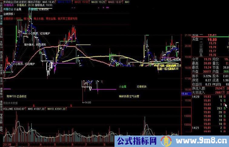价值低点:IF(JTS>0,DRAWLINE(JC,L,REF(JC,1),REF(L,1),1),DRAWNULL),COLORMAGENTA,LINETHICK2;