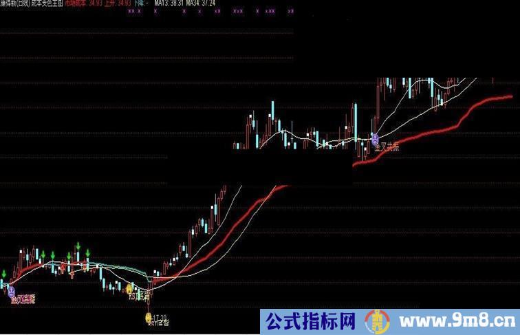 DRAWICON(CROSS(C,市场成本) AND 市场成本>REF(市场成本,1),L-0.20,1);{1号图标显示红脸}