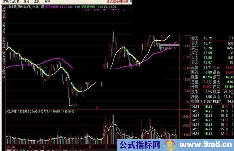 AMV0:=VOL*(O+C)/2; 亚庄生命线:SUM(AMV0,88)/SUM(VOL,88),COLORFF00FF,LINETHICK2; CG:MA(C,17),COLORFFCC66,LINETHICK2; FL:=HHV(CG,2); 亚庄持股线:HHV(CG,2),COLOR00FF00; FS:CG-(FL-CG),COLORYELLOW,LINETHICK2;