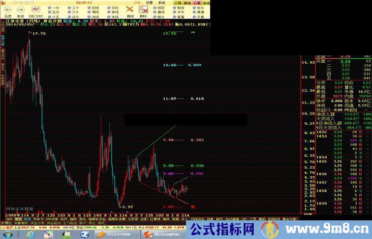 DRAWTEXT(CURRBARSCOUNT=1,H2,' 0.618'),COLORFFFFFF;