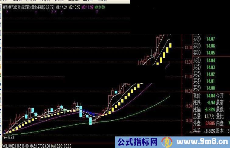 使用方法:本指标适合抓大波段,买点为出现第一个黄金柱,卖点为出现第一个蓝色柱。