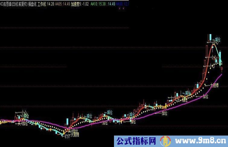 操盘的主图指标有很多,但真正好用实用的少之又少.有的信号不准确,有的显示的太过繁锁,把屏幕划得一团糟甚至连K线都看不清了。本人的这个操盘指标显示简单明了,是买是卖一目了然,对于强势股的判断效果更好。