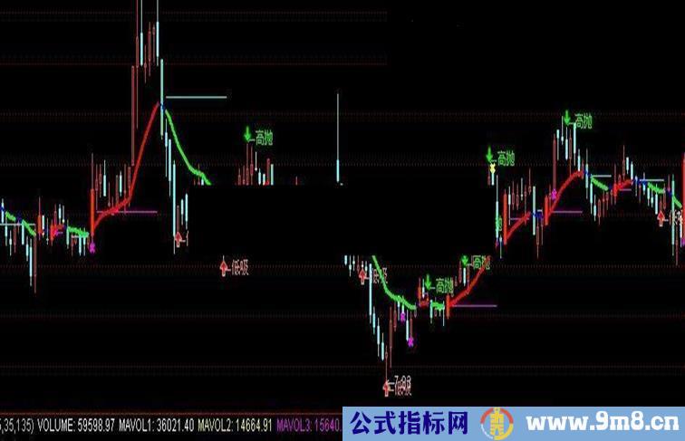 DRAWTEXT(CROSS(庄家,散户) AND 散户>70,H+0.05,'←高抛'),COLORGREEN;