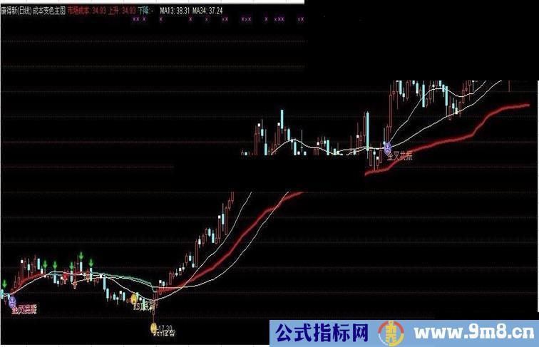 DRAWICON(CROSS(C,市场成本) AND 市场成本>REF(市场成本,1),L-0.20,1);{1号图标显示红脸}