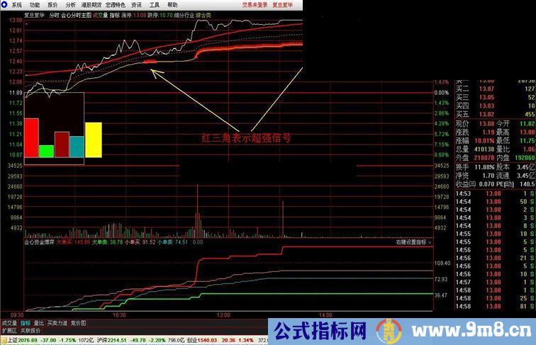 指标说明:当价格线上穿上面的强势线,并且强势线变红,股价就有好的行情,尤其出现红三角那就是真正的强势。