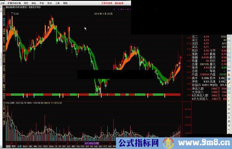 多空趋势彩带:DRAWBAND(SMA(C,6.5,1),RGB(255,97,0),SMA(C,13.5,1),RGB(0,128,0));