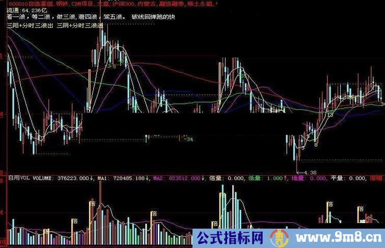 drAWTEXTABS(0,60,'三阳+分时三浪出 三阴+分时三浪进'),LINETHICK1,coloryellow,layer0;