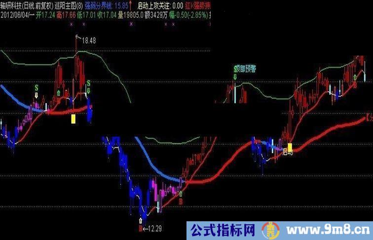 IF(强弱分界线>REF(强弱分界线,1)*0.999 ,强弱分界线,DRAWNULL),COLORRED,LINETHICK4;
