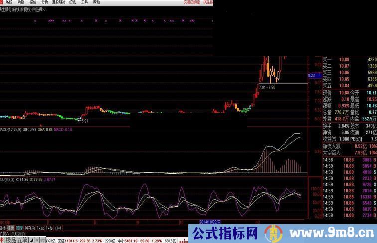 通过看贴,学到了不少东西,下来就在软件上应用,也渐渐有了些体会,今特将感悟发上来,供各位参考。在此,特向年轻老郑致意,本人是学习他的指标精减而来。本指标是将经典指标MACD与KDJ组合的四种状态直接反映到K线的四种颜色上,让使用者仅通过主图K线就能看到更丰富准确的信息。这个设计思想看似简单,但反映出来的东西却可说是深刻的,直观的,有时会发现过去看不到的东西,对使用者操盘非常有利,而且也可作为基本素材再构指标。