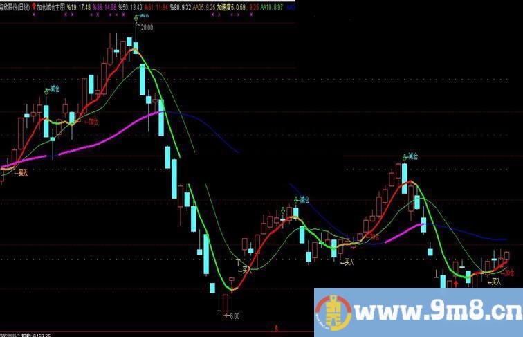 DRAWTEXT(减仓,HIGH*1.02,'←减仓'),COLORCYAN;