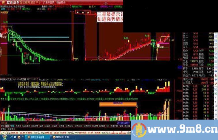 趋势线上升:IF(HS,趋势线,DRAWNULL),LINETHICK2,COLORRED;