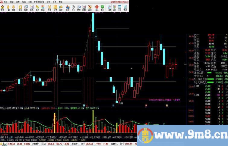 A45:IF(压力线1=REF(压力线1,1),(压力线1-支撑线1)*3/8+支撑线1,DRAWNULL),COLORRED;