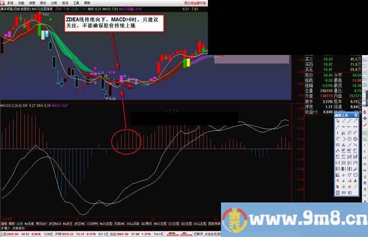 MACD试盘:IF((ZDEA/REF(ZDEA,1)-1)*1000<-10 AND ZDIF>ZDEA,1,0),COLORFF00FF,NODRAW;