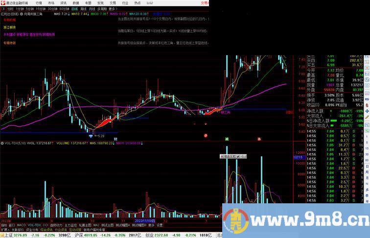 MA60:MA(C,60),LINETHICK2,COLORFF00FF;{要求必须站上60日均线;经研究发现,在出现金银三角附近,