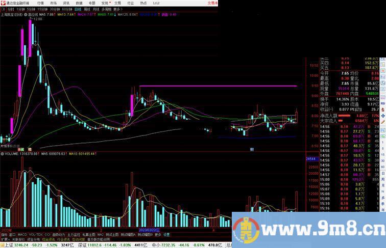 STICKLINE((C-REF(C,1))/REF(C,1)>0.095,C,O,3,0),COLORMAGENTA;
