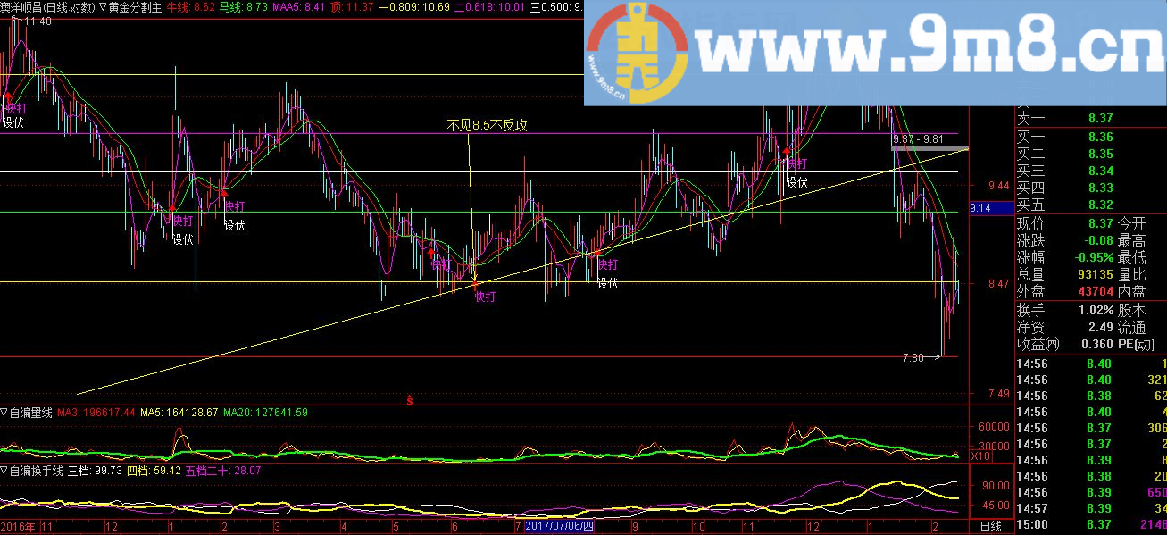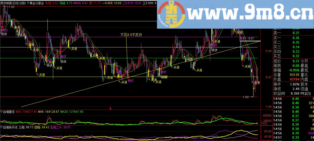 源码中不含下面代码,如你觉得能用可以自己填加进去(图中黄色价柱买入指标不在下载之中)
