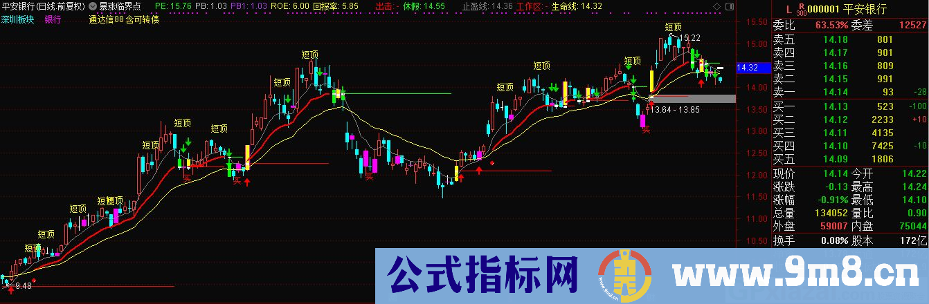工作线:=EMA(C,14);{www.9m8.cn 九毛八公式指标网}