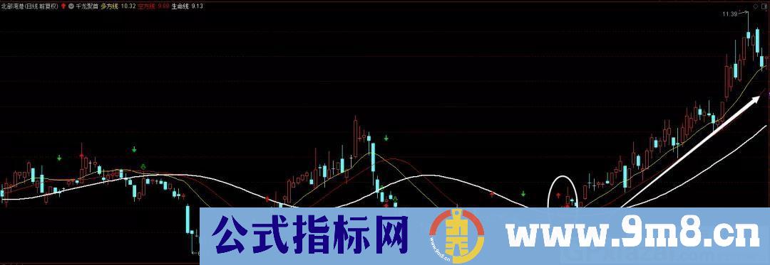2、买点:多方线金叉空方线出红箭头,并且股价位于生命线上方就是买点,可以考虑买入。