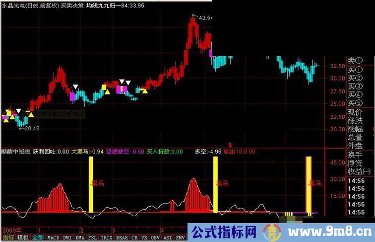 STICKLINE(CROSS(卖线,买线),OPEN,CLOSE,10,0),colormagenta;